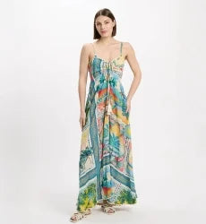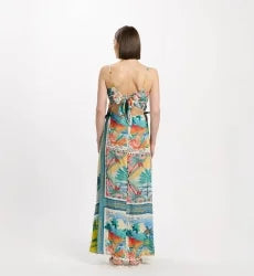 Elegant lange jurk van Miss June, perfect voor de zomer. Dit stijlvolle maxi-jurk heeft een kleurrijk printontwerp met tropische bladeren en bloemen, ideaal voor warme dagen. De jurk heeft een verfijnde pasvorm met een mooie vetersluiting aan de voorkant, waardoor het een luchtige en vrouwelijke uitstraling heeft. Dit jurkje is een must-have voor je zomergarderobe, geschikt voor zowel casual als feestelijke gelegenheiden. Draag het naar het strand, een tuinfest of een avond uit.