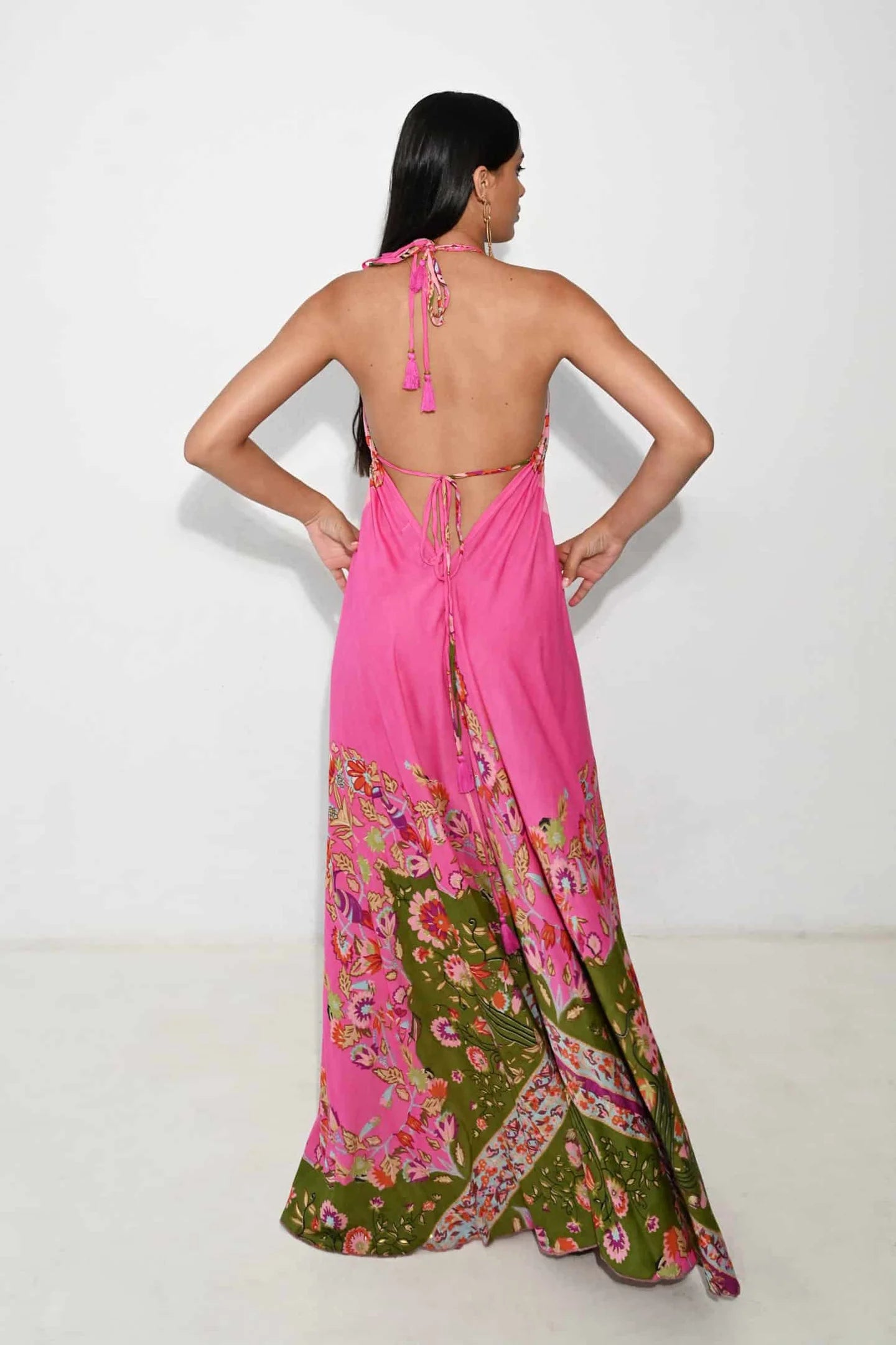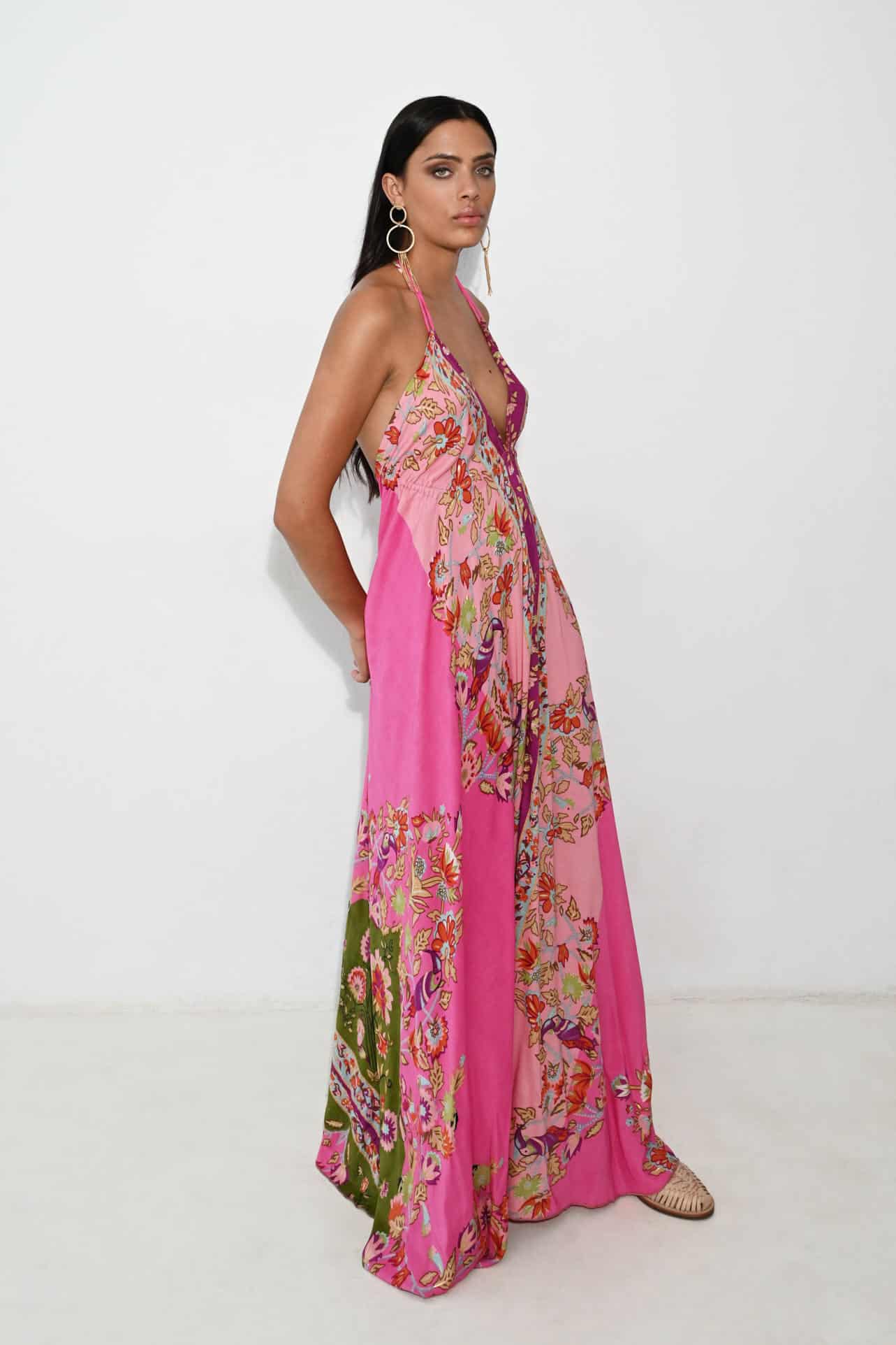 Stijlvol en elegant Piti Cuiti jurk met een kleurrijk bloemenpatroon in roze en groen. Dit lange, luchtige ontwerp heeft een verfijnde open rug en een verstelbare strikband voor extra comfort. Perfect voor zomerbrunches, strandfeesten of een casual avond uit. Ideaal voor modebewuste vrouwen die op zoek zijn naar een speelse, maar chique uitstraling. De mix van bloemenprint en felle kleuren maakt het een opvallende keuze voor elke gelegenheid.