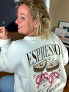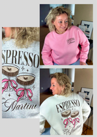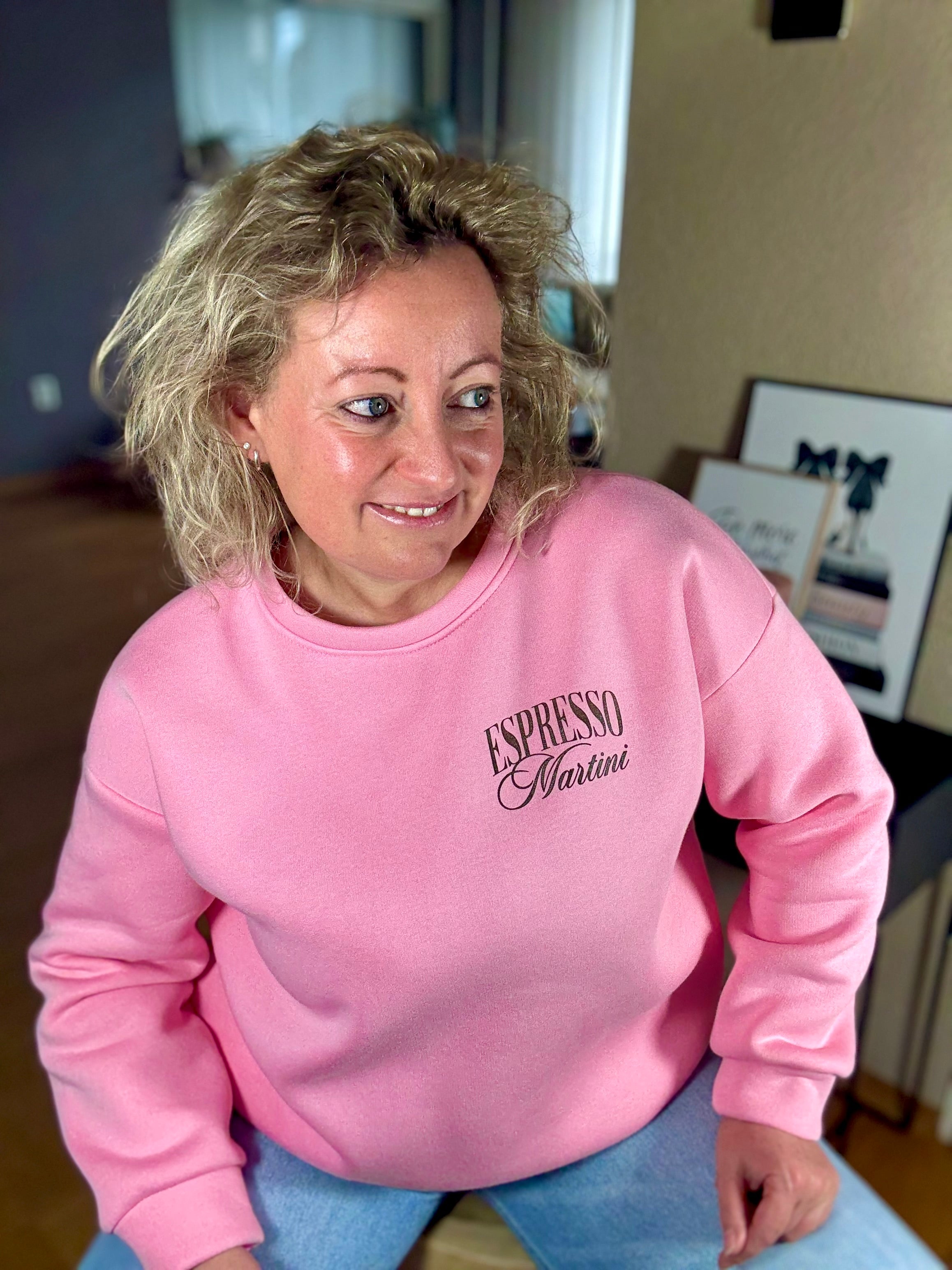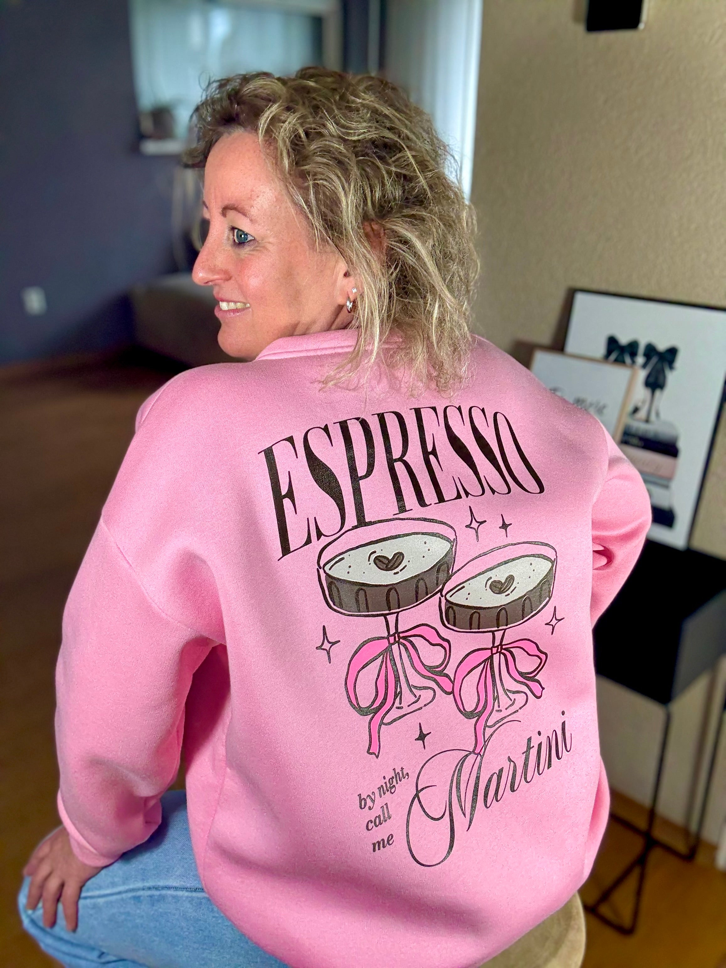 Deze comfortabele sweater is verkrijgbaar in drie kleuren: roze, wit en grijs. Het ontwerp is speels een trendy, met de tekst „ESPRESSO Martini“ en een illustratie van een martini glas met een hartje en een strik. De achterkant van de sweater is versierd met de tekst „by night, call me Martini“, perfect voor wie van een goede espresso martini houdt. De zachte stof maakt het een ideale keuze voor elke casual gelegenheid.